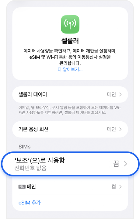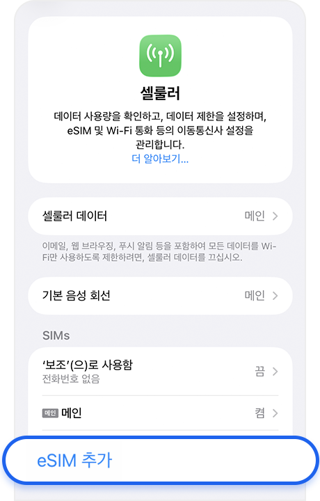 설정 > 셀룰러 > 'eSIM 추가' 선택
